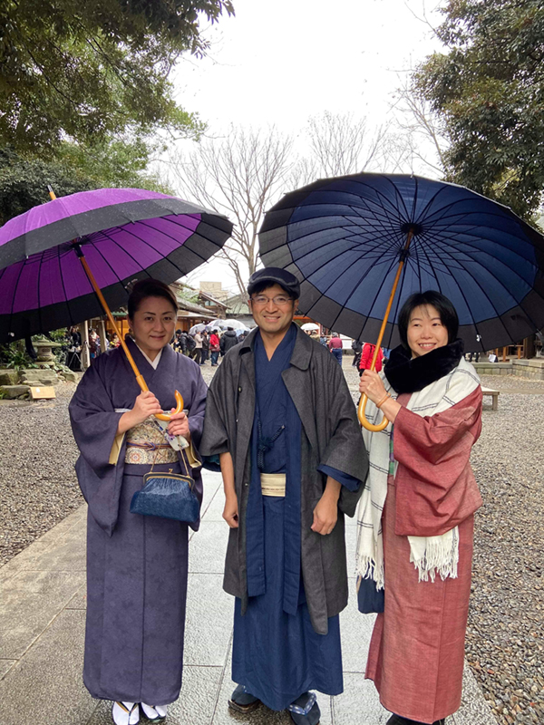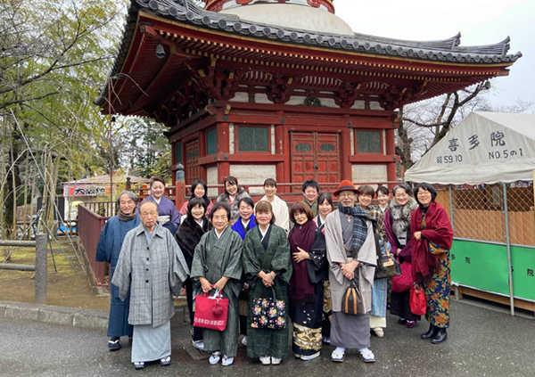 雪も散らつくなか、集合場所の「着物のお寺」蓮馨寺には、50人近い着物を着た参加者が集まりました。