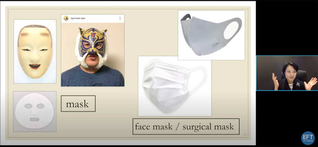 最近では、コロナ渦で“マスク”という単語をよく使うようになりましたが、英語で”mask”というと一般的には仮面やフェイスパックのことを指すので、”face mask” や“surgical mask”を使うというのも勉強になりました。