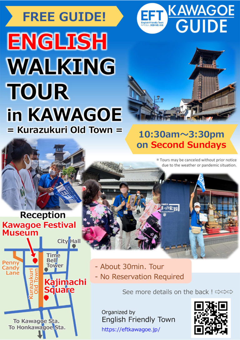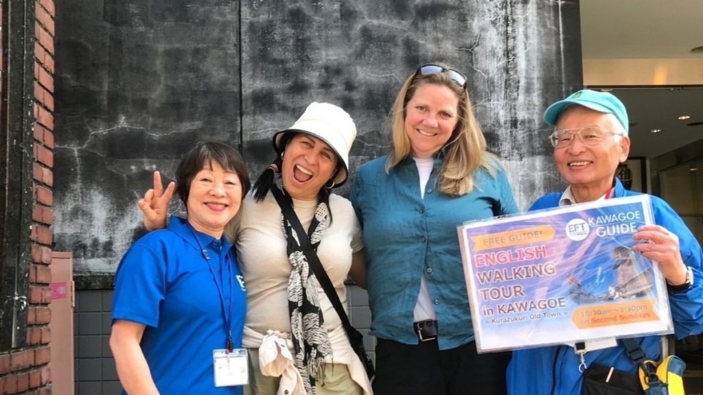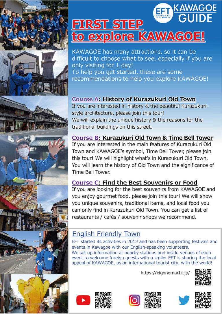一番街周辺で、英語ガイドのスキルを身につけたボランティア会員が、青いユニフォームを着て、外国人観光客向けの無料ウォーキングツアーを提供しています。時の鐘を含めた一番街の見どころ、蔵造り建築の構造や街の歴史、川越ならではのお土産品や人気のローカルフードなど、川越の魅力や豊かな文化を英語で伝えていきます。